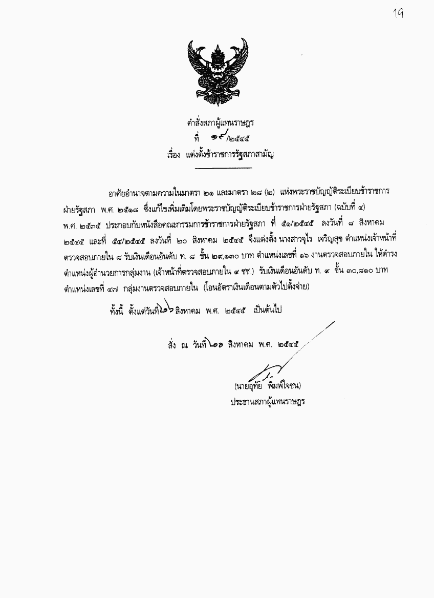 ชื่อเอกสาร : คำสั่งสภาผู้แทนราษฎร ที่ 19/2545 เรื่อง แต่งตั้งข้าราชการรัฐสภาสามัญ