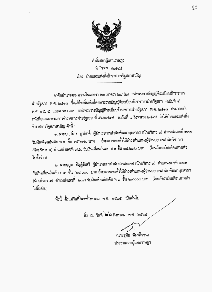คำสั่งสภาผู้แทนราษฎร ที่ 20/2545 เรื่อง ย้ายและแต่งตั้งข้าราชการรัฐสภาสามัญ |