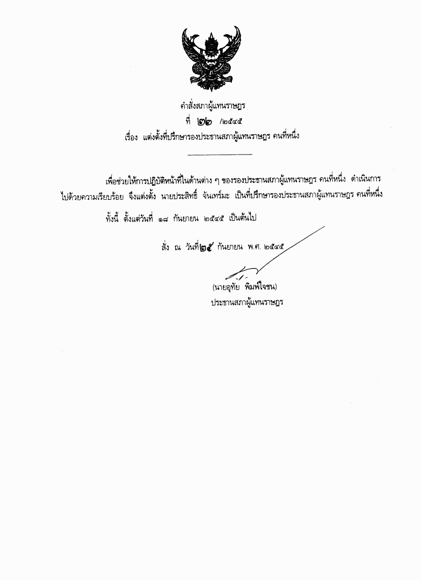คำสั่งสภาผู้แทนราษฎร ที่ 22/2545 เรื่อง แต่งตั้งที่ปรึกษารองประธานสภาผู้แทนราษฎร คนที่หนึ่ง |