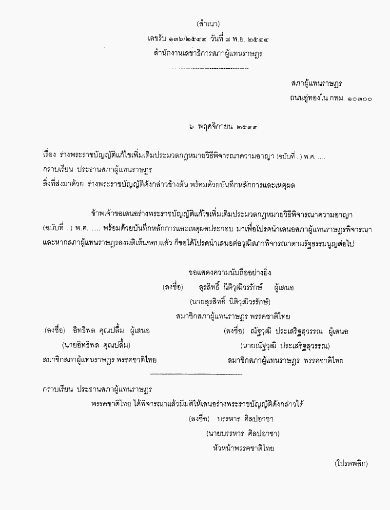 • ร่างพระราชบัญญัติแก้ไขเพิ่มเติมประมวลกฎหมายวิธีพิจารณาความอาญา (ฉบับที่ ..) พ.ศ. .... (นายสุรสิทธิ์ นิติวุฒิวรรักษ์ กับคณะ เป็นผู้เสนอ)
