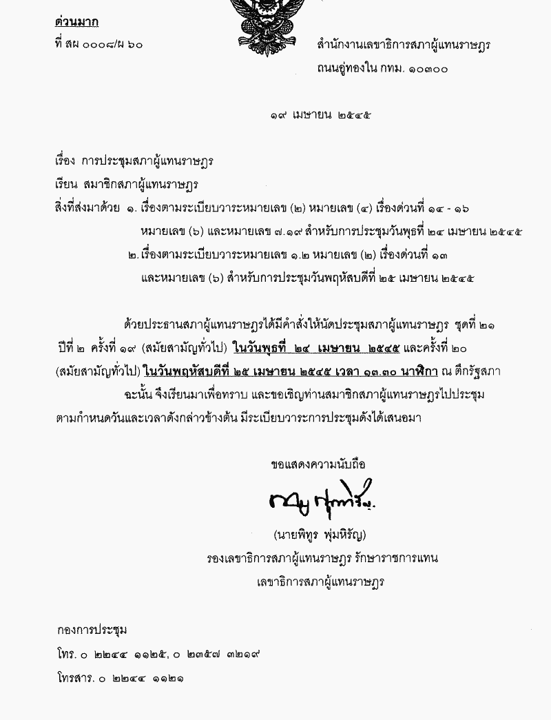 ชื่อเอกสาร : ระเบียบวาระการประชุมสภาผู้แทนราษฎร ชุดที่ 21 ปีที่ 2 ครั้งที่ 19 (สมัยสามัญทั่วไป) วันพุธที่ 24 เมษายน 2545