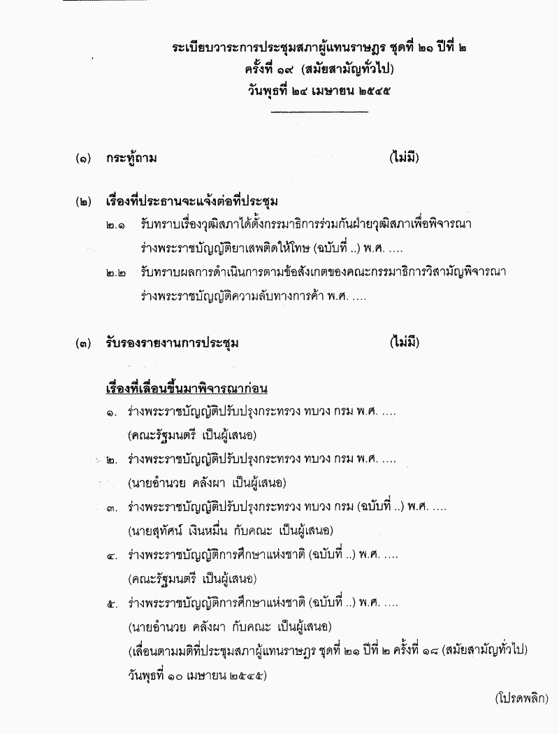 • ระเบียบวาระการประชุมสภาผู้แทนราษฎร ชุดที่ 21 ปีที่ 2 ครั้งที่ 19 (สมัยสามัญทั่วไป) วันพุธที่ 24 เมษายน 2545