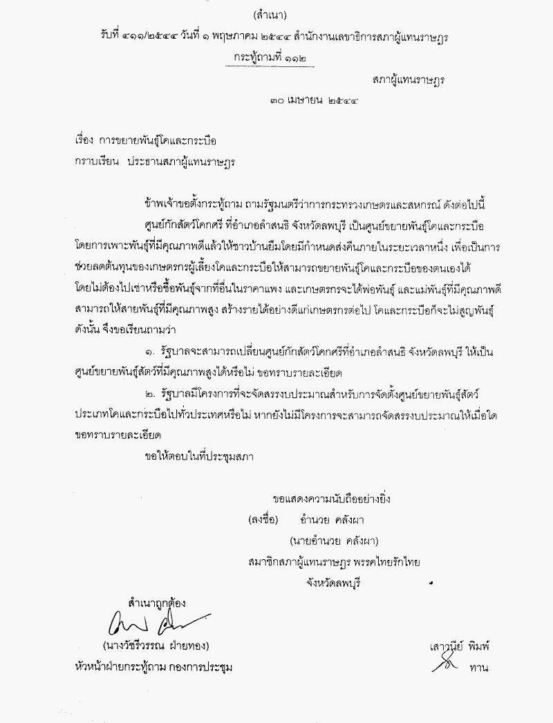 กระทู้ถามที่ 112 เรื่อง การขยายพันธุ์โคและกระบือ นายอำนวย คลังผา เป็นผู้ตั้งกระทู้ถาม ถามรัฐมนตรีว่าการกระทรวงเกษตรและสหกรณ์ |