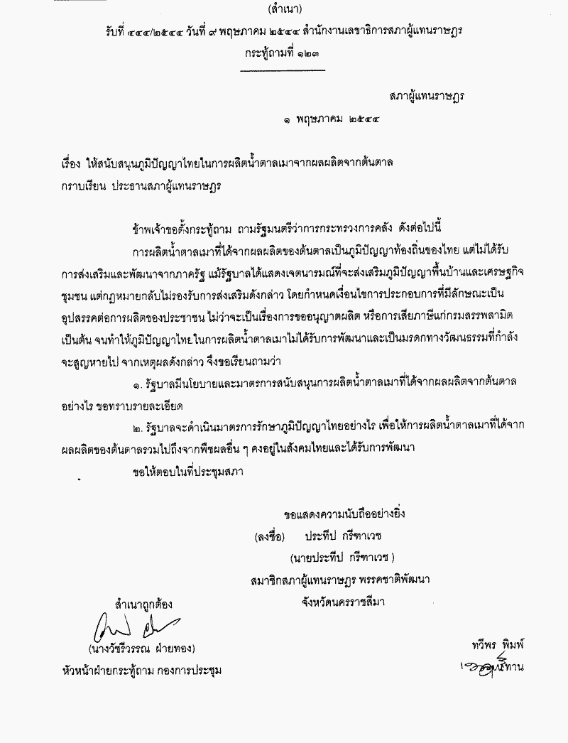 กระทู้ถามที่ 123 เรื่อง ให้สนับสนุนภูมิปัญญาไทยในการผลิตน้ำตาลเมาจากผลผลิตจากต้นตาล นายประทีป กรีฑาเวช เป็นผู้ตั้งกระทู้ถาม ถามรัฐมนตรีว่าการกระทรวงการคลัง |