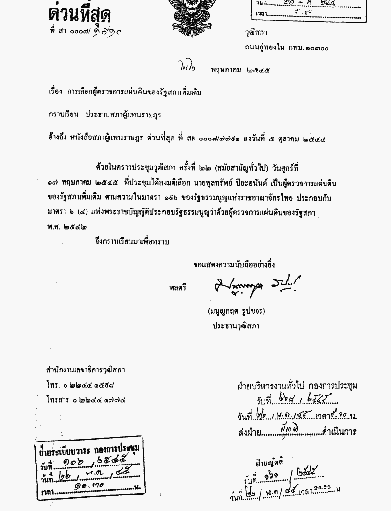 รับทราบเรื่องวุฒิสภาได้ลงมติเลือกนายพูลทรัพย์ ปิยะอนันต์ เป็นผู้ตรวจการแผ่นดินของรัฐสภาเพิ่มเติม |
