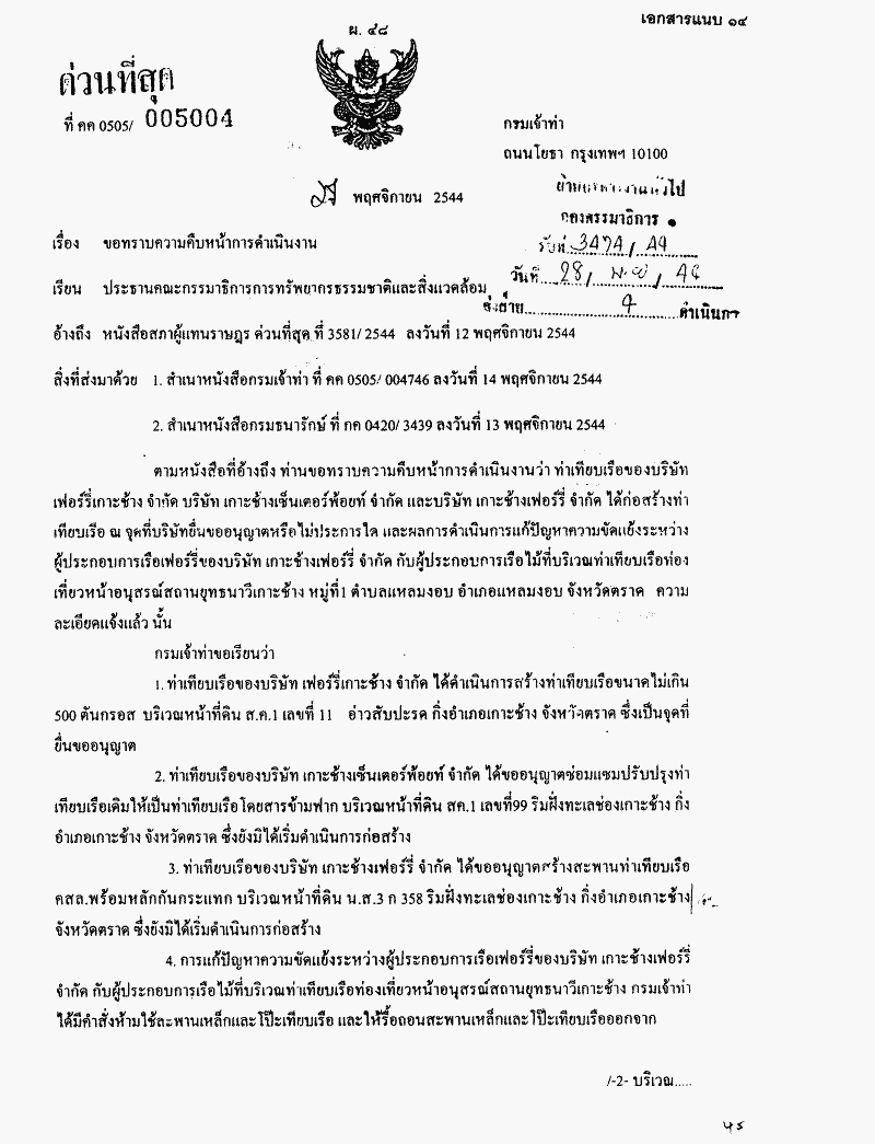 รายงานผลการพิจารณาปัญหาร้องเรียนโครงการก่อสร้างท่าเทียบเรือ ตำบลเกาะช้าง กิ่งอำเภอเกาะช้าง จังหวัดตราด ซึ่งคณะกรรมาธิการการทรัพยากรธรรมชาติและสิ่งแวดล้อมพิจารณาเสร็จแล้ว