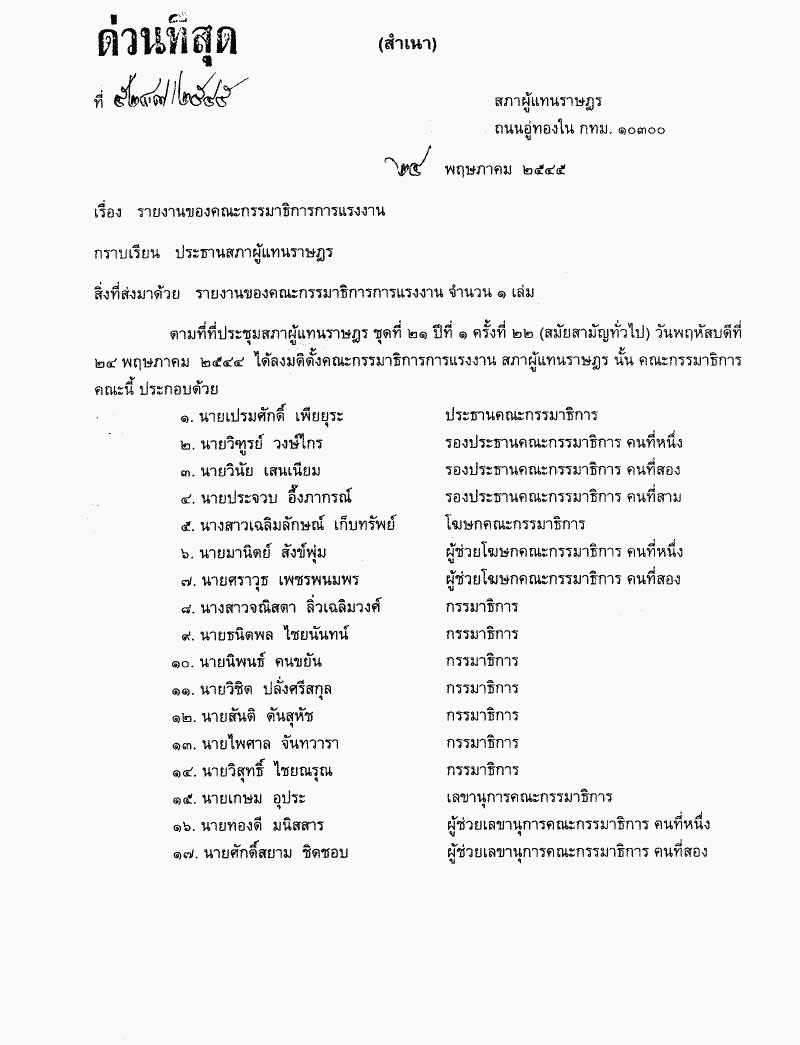 รายงานผลการพิจารณาศึกษาเรื่องการจัดหางานและคุ้มครองคนหางานที่ไปทำงานต่างประเทศ ซึ่งคณะกรรมาธิการการแรงงานพิจารณาเสร็จแล้ว