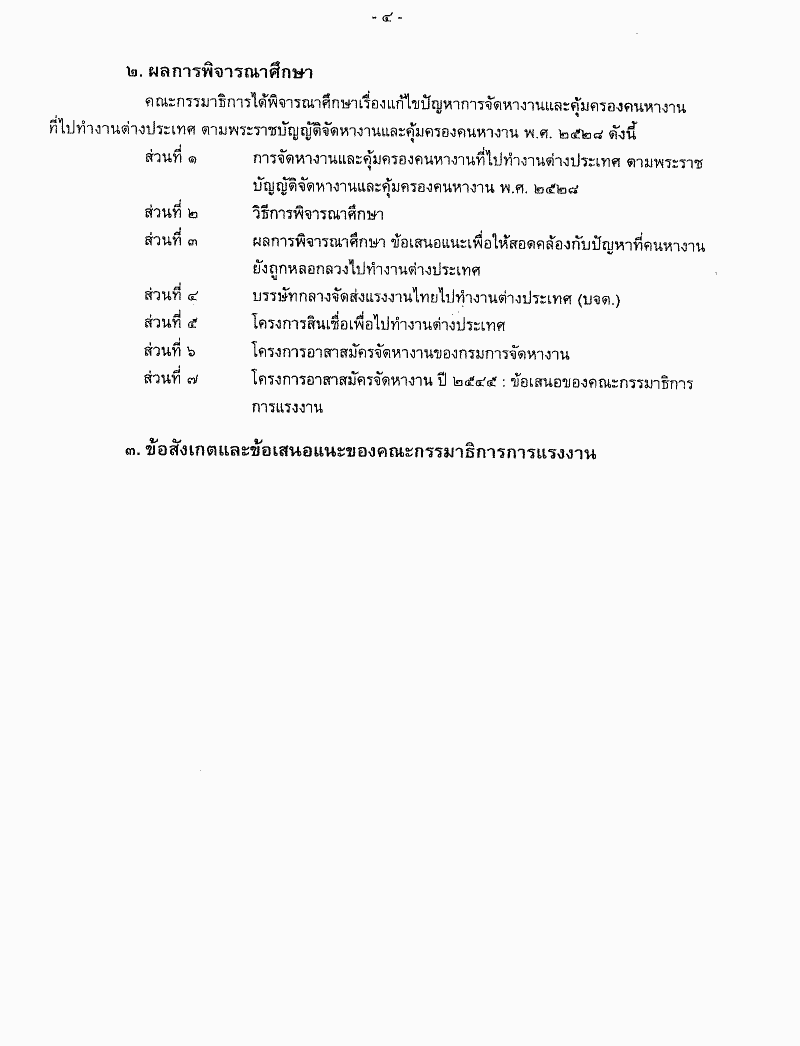 รายงานผลการพิจารณาศึกษาเรื่องการจัดหางานและคุ้มครองคนหางานที่ไปทำงานต่างประเทศ ซึ่งคณะกรรมาธิการการแรงงานพิจารณาเสร็จแล้ว
