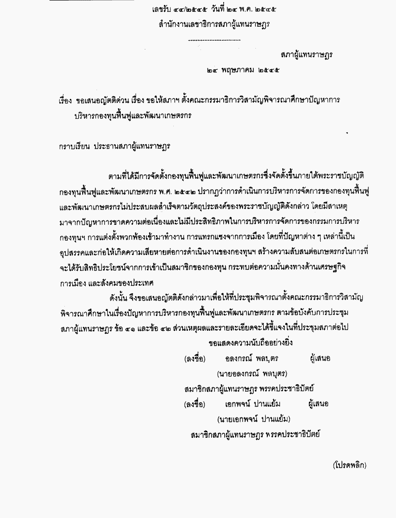 • ขอเสนอญัตติด่วน เรื่อง ขอให้สภาฯ ตั้งคณะกรรมาธิการวิสามัญพิจารณาศึกษา ปัญหาการบริหารกองทุนฟื้นฟูและพัฒนาเกษตรกร