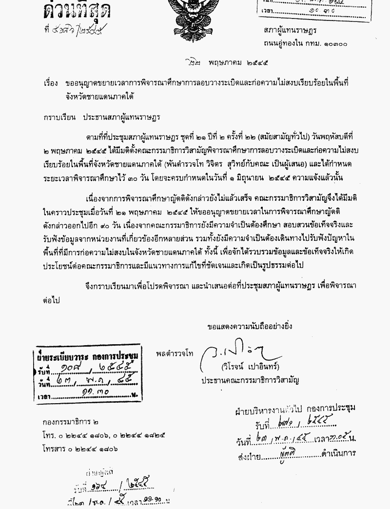 ขออนุญาตขยายเวลาการพิจารณาศึกษาการลอบวางระเบิดและก่อความไม่สงบเรียบร้อยในพื้นที่จังหวัดชายแดนภาคใต้ |
