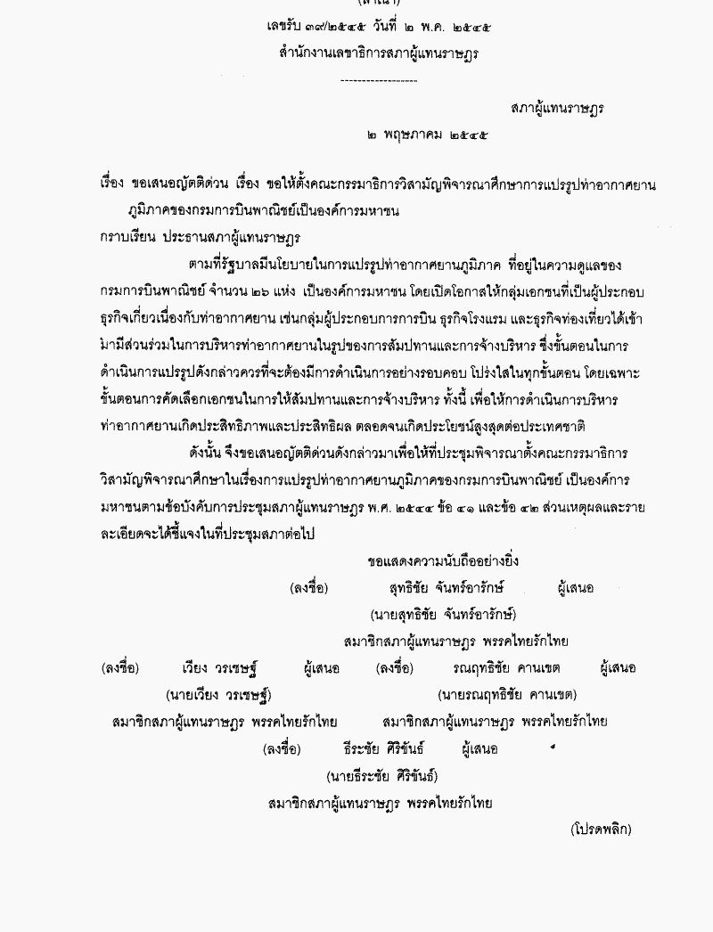 ขอเสนอญัตติด่วน เรื่อง ขอให้ตั้งคณะกรรมาธิการวิสามัญพิจารณาศึกษาการแปรรูปท่าอากาศยานภูมิภาคของกรมการบินพาณิชย์เป็นองค์การมหาชน |