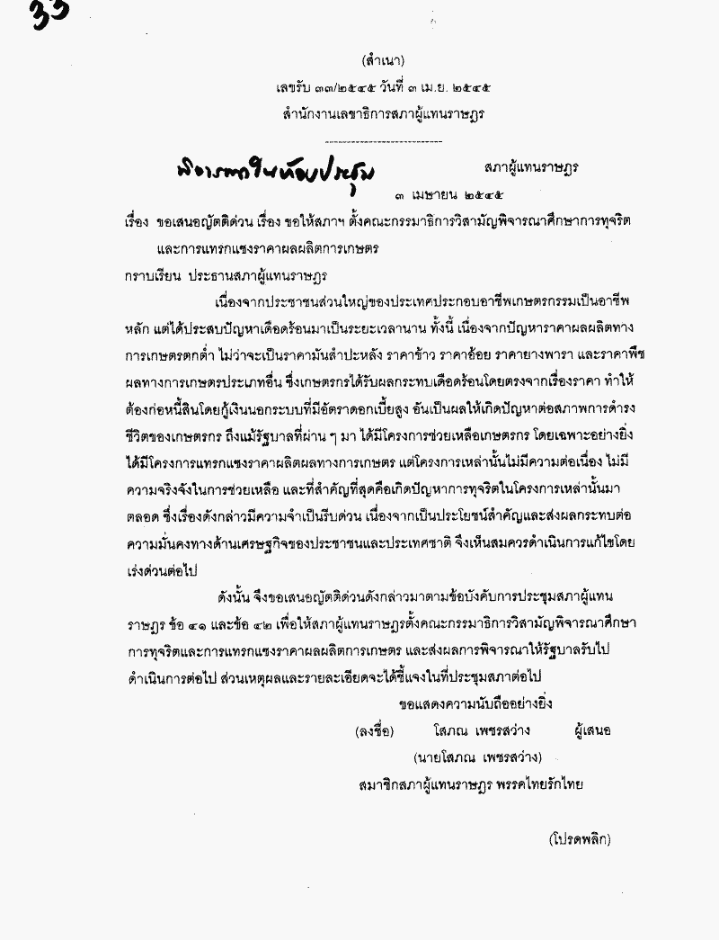 ขอเสนอญัตติด่วน เรื่อง ขอให้สภาฯ ตั้งคณะกรรมาธิการวิสามัญพิจารณาศึกษาการทุจริตและการแทรกแซงราคาผลผลิตการเกษตร |