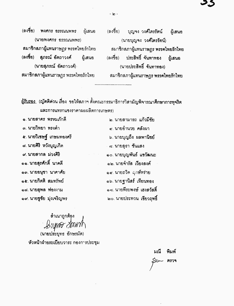 • ขอเสนอญัตติด่วน เรื่อง ขอให้สภาฯ ตั้งคณะกรรมาธิการวิสามัญพิจารณาศึกษาการทุจริตและการแทรกแซงราคาผลผลิตการเกษตร