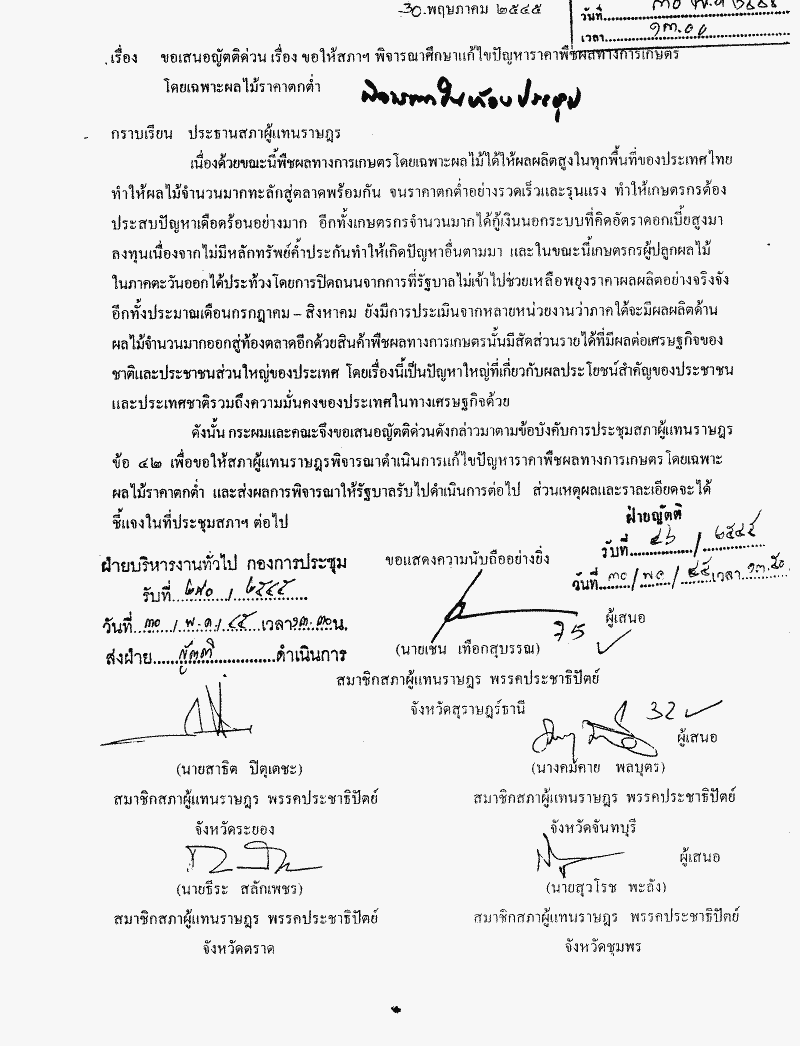 • ขอเสนอญัตติด่วน เรื่อง ขอให้สภาฯ พิจารณาศึกษาแก้ไขปัญหาราคาพืชผลทางการเกษตรโดยเฉพาะผลไม้ราคาตกต่ำ