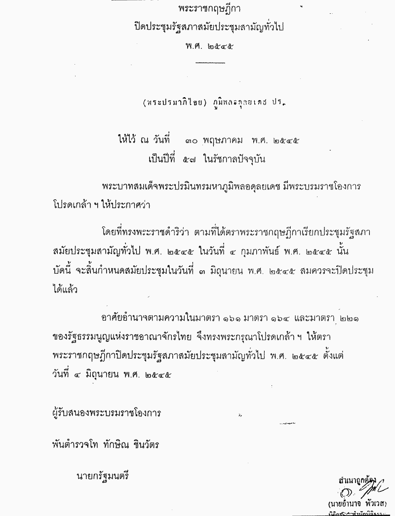 ชื่อเอกสาร : พระราชกฤษฎีกา ปิดประชุมรัฐสภาสมัยประชุมสามัญทั่วไป พ. ศ. 2545