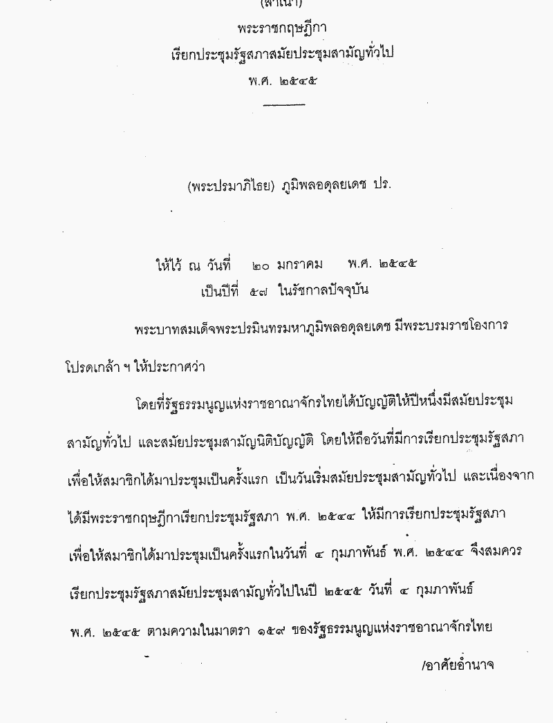 ชื่อเอกสาร :   พระราชกฤษฎีกา เรียกประชุมรัฐสภาสมัยประชุมสามัญทั่วไป พ. ศ. 2545