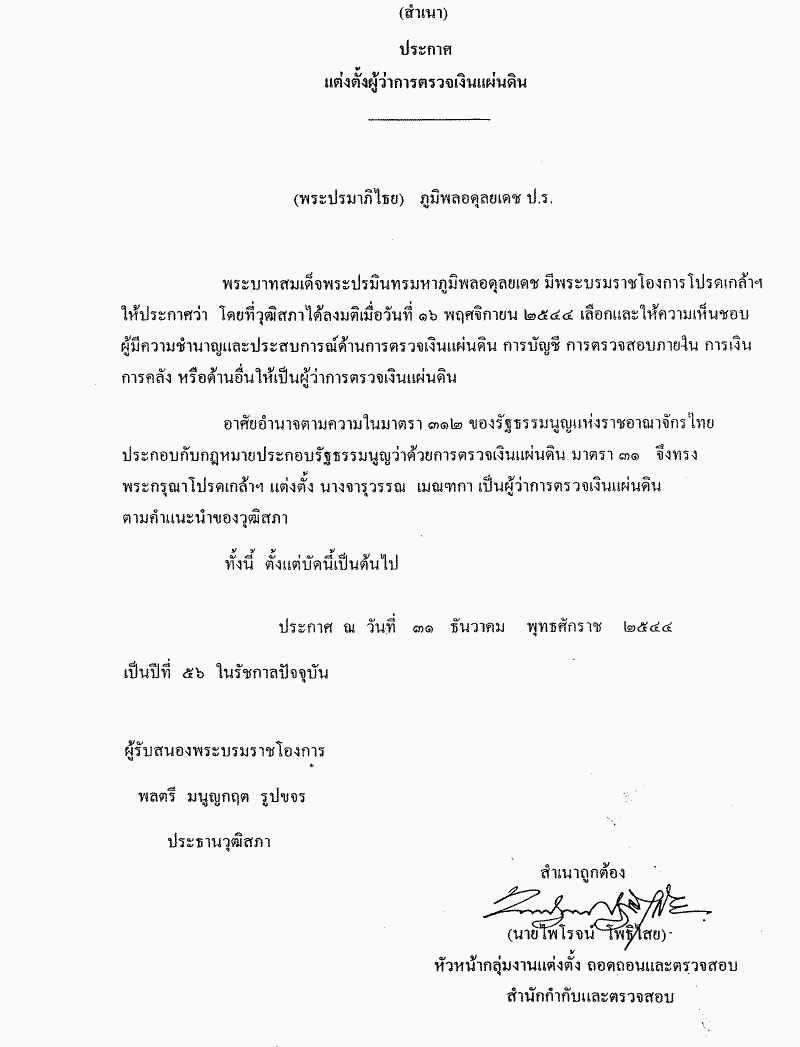 ชื่อเอกสาร : ประกาศแต่งตั้งผู้ว่าการตรวจเงินแผ่นดิน