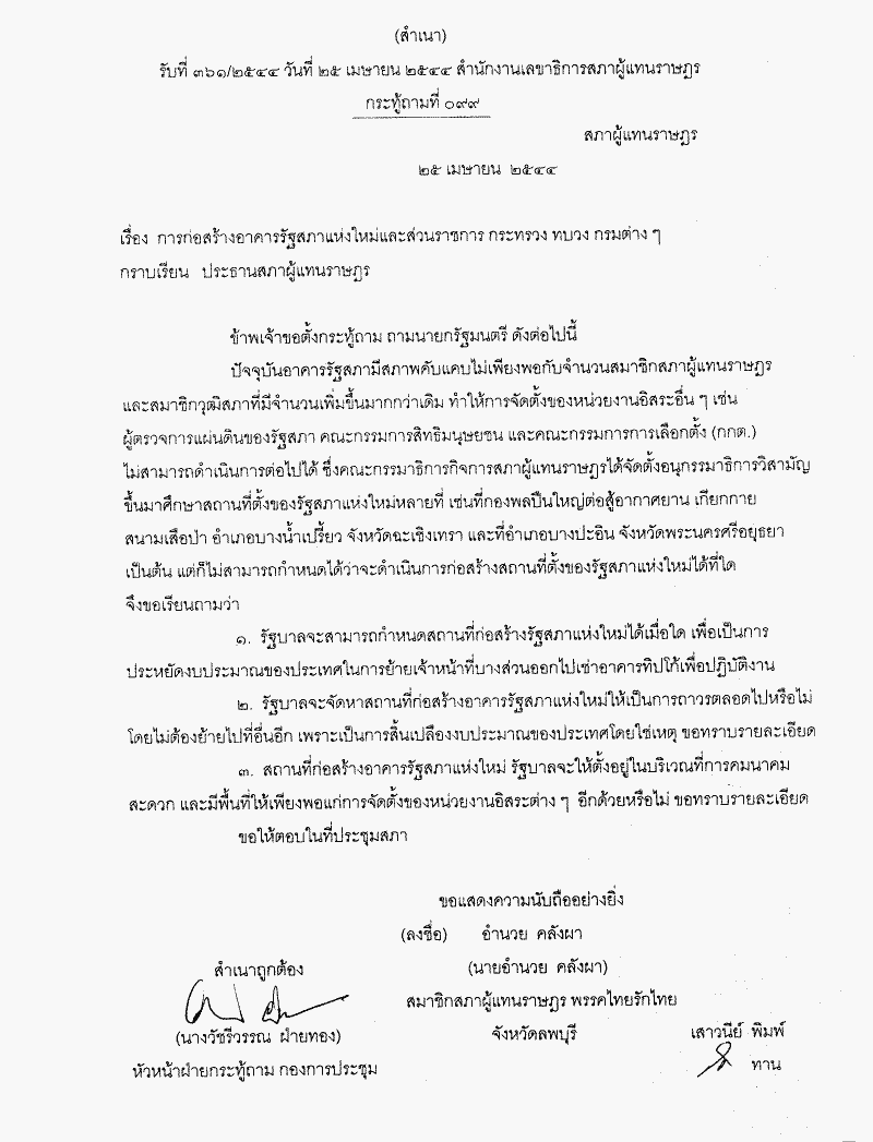 กระทู้ถามที่ 099 เรื่องการก่อสร้างอาคารรัฐสภาแห่งใหม่และส่วนราชการ กระทรวง ทบวง กรมต่าง ๆ นายอำนวย คลังผา เป็นผู้ตั้งกระทู้ถาม ถามนายกรัฐมนตรี |