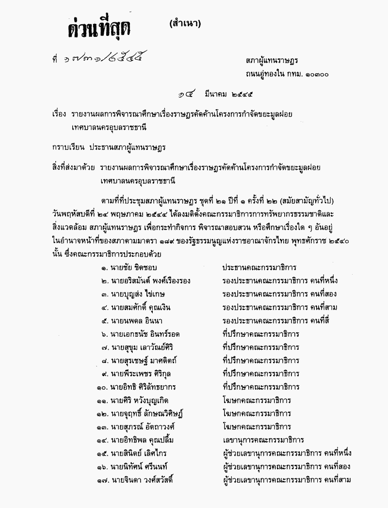 รายงานผลการพิจารณาศึกษา เรื่อง ราษฎรคัดค้านโครงการกำจัดขยะมูลฝอยเทศบาลนครอุบลราชธานี ซึ่งคณะกรรมาธิการการทรัพยากรธรรมชาติและสิ่งแวดล้อมพิจารณาเสร็จแล้ว