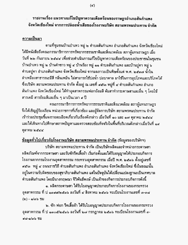 รายงานผลการพิจารณาศึกษาปัญหาความเดือดร้อนของราษฎรอำเภอสันกำแพง จังหวัดเชียงใหม่ จากการปล่อยน้ำเสียของโรงงานบริษัท สยามพรหมประทาน จำกัด ซึ่งคณะกรรมาธิการการทรัพยากรธรรมชาติและสิ่งแวดล้อมพิจารณาเสร็จแล้ว
