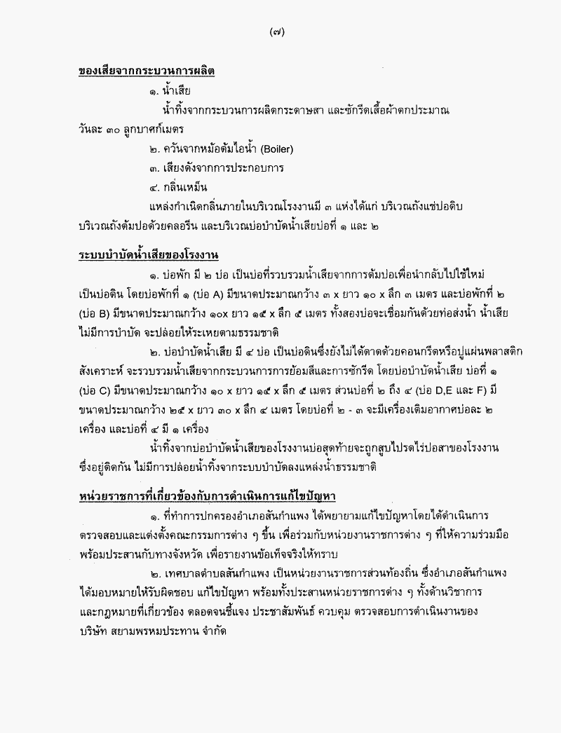 รายงานผลการพิจารณาศึกษาปัญหาความเดือดร้อนของราษฎรอำเภอสันกำแพง จังหวัดเชียงใหม่ จากการปล่อยน้ำเสียของโรงงานบริษัท สยามพรหมประทาน จำกัด ซึ่งคณะกรรมาธิการการทรัพยากรธรรมชาติและสิ่งแวดล้อมพิจารณาเสร็จแล้ว