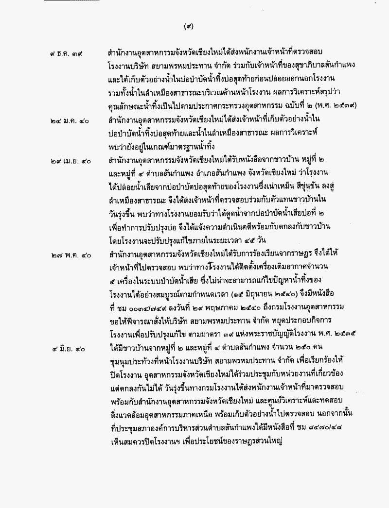 รายงานผลการพิจารณาศึกษาปัญหาความเดือดร้อนของราษฎรอำเภอสันกำแพง จังหวัดเชียงใหม่ จากการปล่อยน้ำเสียของโรงงานบริษัท สยามพรหมประทาน จำกัด ซึ่งคณะกรรมาธิการการทรัพยากรธรรมชาติและสิ่งแวดล้อมพิจารณาเสร็จแล้ว