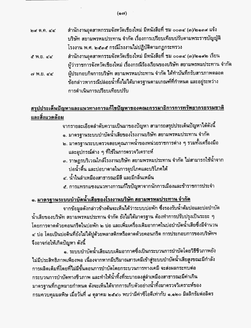 รายงานผลการพิจารณาศึกษาปัญหาความเดือดร้อนของราษฎรอำเภอสันกำแพง จังหวัดเชียงใหม่ จากการปล่อยน้ำเสียของโรงงานบริษัท สยามพรหมประทาน จำกัด ซึ่งคณะกรรมาธิการการทรัพยากรธรรมชาติและสิ่งแวดล้อมพิจารณาเสร็จแล้ว