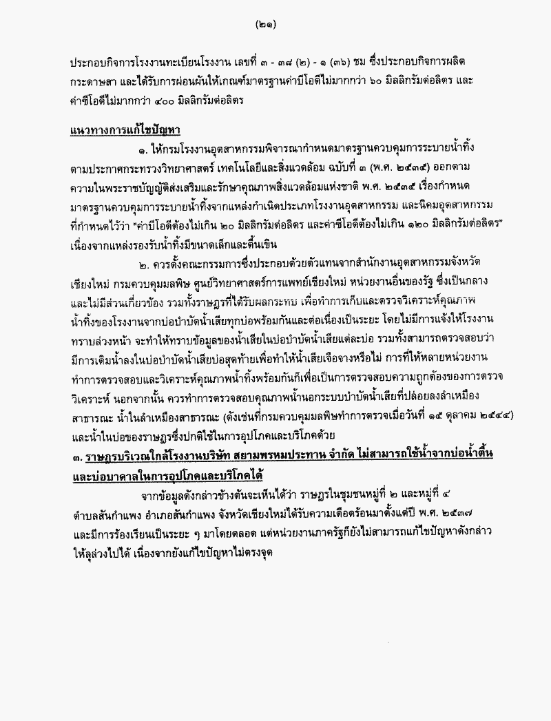 รายงานผลการพิจารณาศึกษาปัญหาความเดือดร้อนของราษฎรอำเภอสันกำแพง จังหวัดเชียงใหม่ จากการปล่อยน้ำเสียของโรงงานบริษัท สยามพรหมประทาน จำกัด ซึ่งคณะกรรมาธิการการทรัพยากรธรรมชาติและสิ่งแวดล้อมพิจารณาเสร็จแล้ว