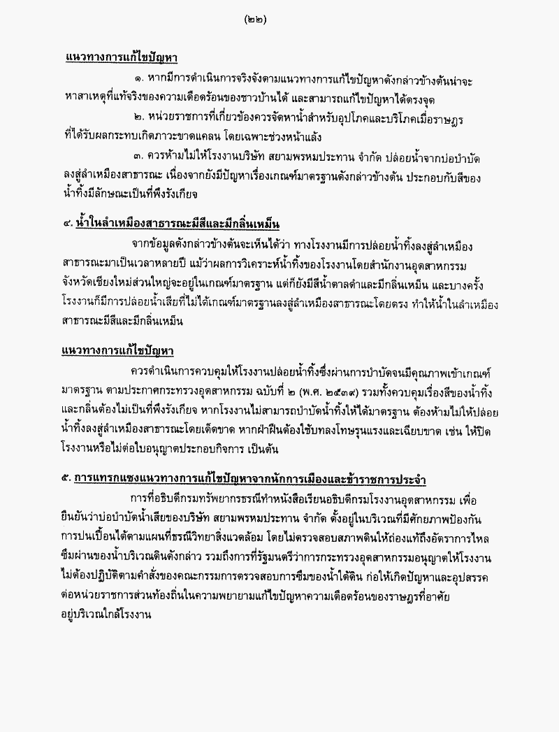 รายงานผลการพิจารณาศึกษาปัญหาความเดือดร้อนของราษฎรอำเภอสันกำแพง จังหวัดเชียงใหม่ จากการปล่อยน้ำเสียของโรงงานบริษัท สยามพรหมประทาน จำกัด ซึ่งคณะกรรมาธิการการทรัพยากรธรรมชาติและสิ่งแวดล้อมพิจารณาเสร็จแล้ว