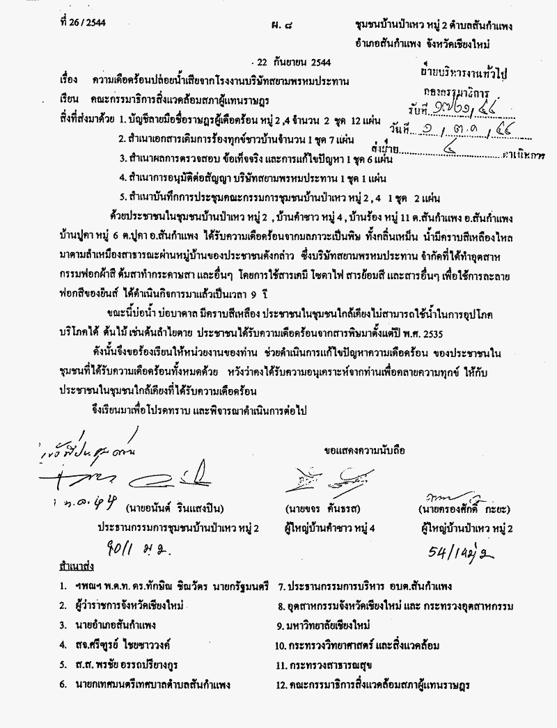 รายงานผลการพิจารณาศึกษาปัญหาความเดือดร้อนของราษฎรอำเภอสันกำแพง จังหวัดเชียงใหม่ จากการปล่อยน้ำเสียของโรงงานบริษัท สยามพรหมประทาน จำกัด ซึ่งคณะกรรมาธิการการทรัพยากรธรรมชาติและสิ่งแวดล้อมพิจารณาเสร็จแล้ว