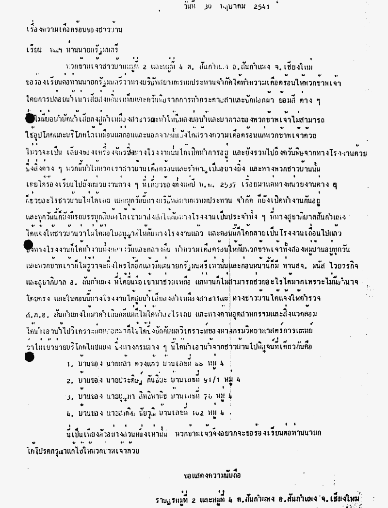 รายงานผลการพิจารณาศึกษาปัญหาความเดือดร้อนของราษฎรอำเภอสันกำแพง จังหวัดเชียงใหม่ จากการปล่อยน้ำเสียของโรงงานบริษัท สยามพรหมประทาน จำกัด ซึ่งคณะกรรมาธิการการทรัพยากรธรรมชาติและสิ่งแวดล้อมพิจารณาเสร็จแล้ว
