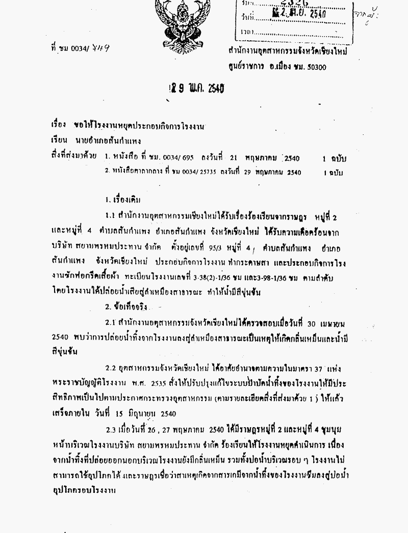 รายงานผลการพิจารณาศึกษาปัญหาความเดือดร้อนของราษฎรอำเภอสันกำแพง จังหวัดเชียงใหม่ จากการปล่อยน้ำเสียของโรงงานบริษัท สยามพรหมประทาน จำกัด ซึ่งคณะกรรมาธิการการทรัพยากรธรรมชาติและสิ่งแวดล้อมพิจารณาเสร็จแล้ว
