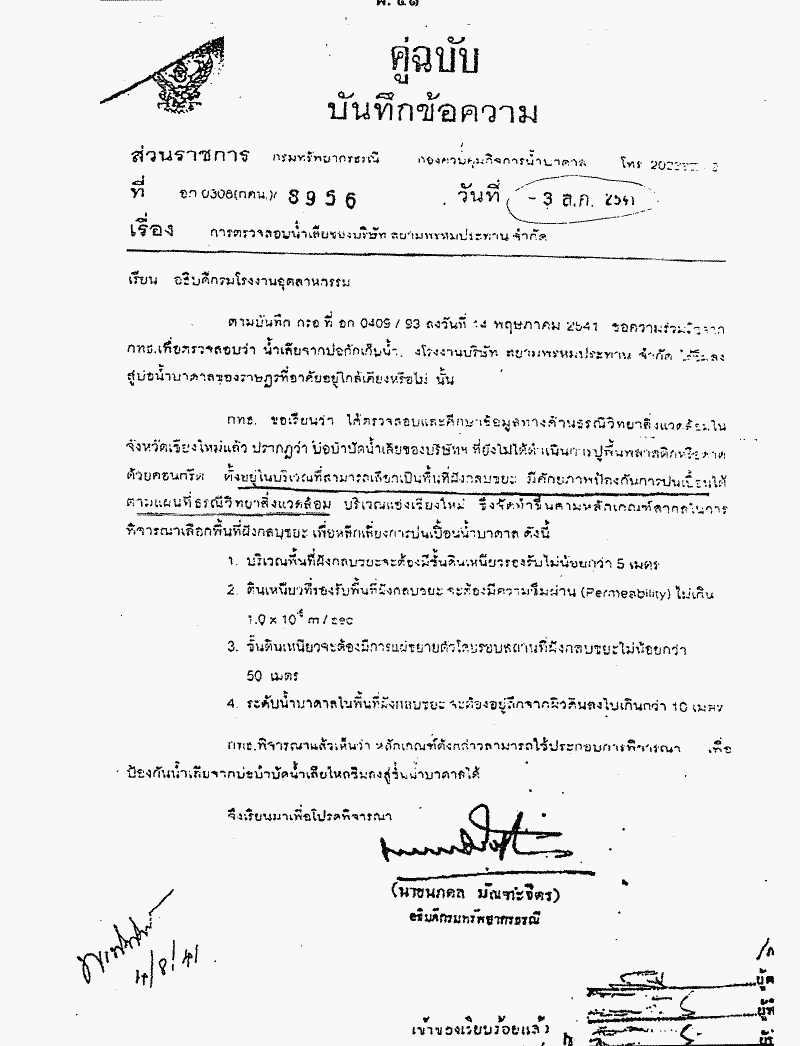 รายงานผลการพิจารณาศึกษาปัญหาความเดือดร้อนของราษฎรอำเภอสันกำแพง จังหวัดเชียงใหม่ จากการปล่อยน้ำเสียของโรงงานบริษัท สยามพรหมประทาน จำกัด ซึ่งคณะกรรมาธิการการทรัพยากรธรรมชาติและสิ่งแวดล้อมพิจารณาเสร็จแล้ว