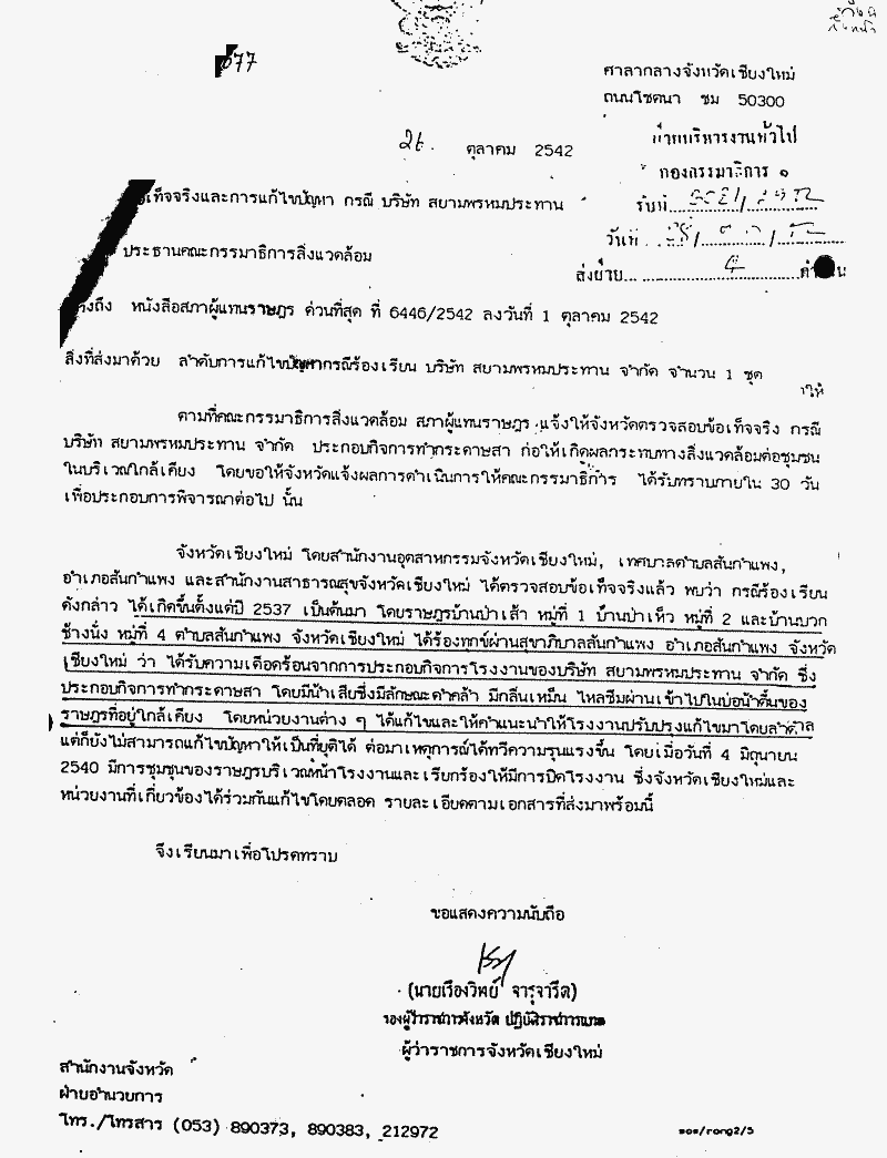 รายงานผลการพิจารณาศึกษาปัญหาความเดือดร้อนของราษฎรอำเภอสันกำแพง จังหวัดเชียงใหม่ จากการปล่อยน้ำเสียของโรงงานบริษัท สยามพรหมประทาน จำกัด ซึ่งคณะกรรมาธิการการทรัพยากรธรรมชาติและสิ่งแวดล้อมพิจารณาเสร็จแล้ว