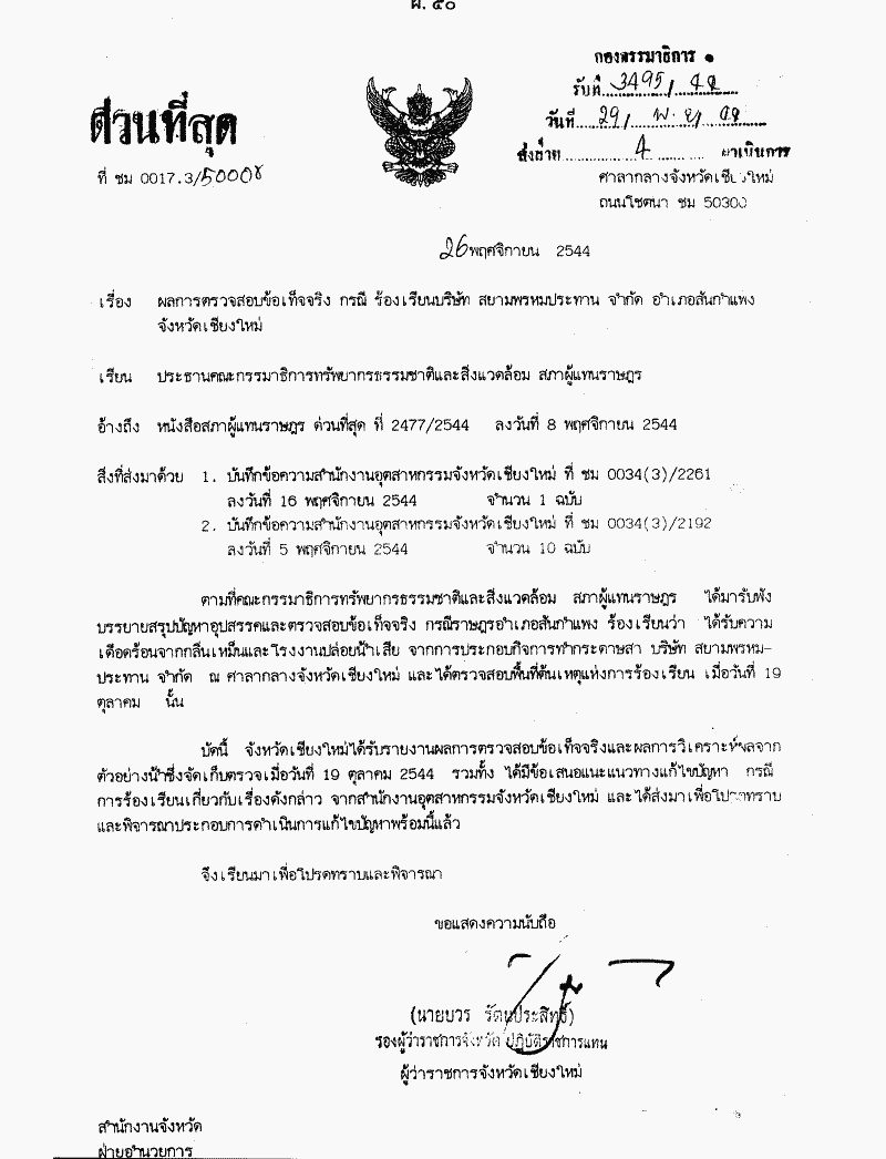 รายงานผลการพิจารณาศึกษาปัญหาความเดือดร้อนของราษฎรอำเภอสันกำแพง จังหวัดเชียงใหม่ จากการปล่อยน้ำเสียของโรงงานบริษัท สยามพรหมประทาน จำกัด ซึ่งคณะกรรมาธิการการทรัพยากรธรรมชาติและสิ่งแวดล้อมพิจารณาเสร็จแล้ว