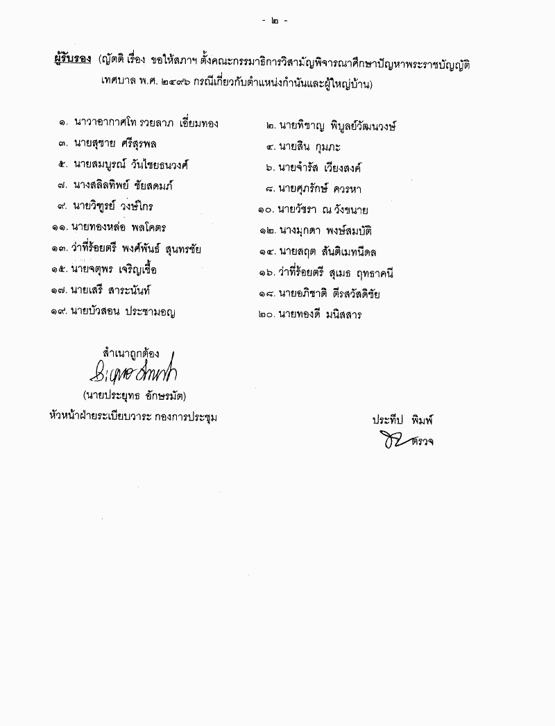 • ขอเสนอญัตติ เรื่อง ขอให้สภาฯ ตั้งคณะกรรมาธิการวิสามัญเพื่อพิจารณาศึกษาปัญหาพระราชบัญญัติเทศบาล พ.ศ. 2496 กรณีเกี่ยวกับตำแหน่งกำนันและผู้ใหญ่บ้าน