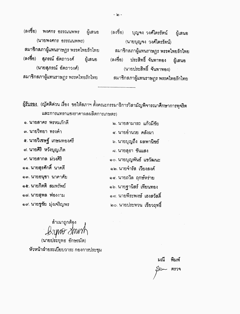 ขอเสนอญัตติด่วน เรื่อง ขอให้สภาฯ ตั้งคณะกรรมาธิการวิสามัญพิจารณาศึกษาการทุจริตและการแทรกแซงราคาผลผลิตการเกษตร |
