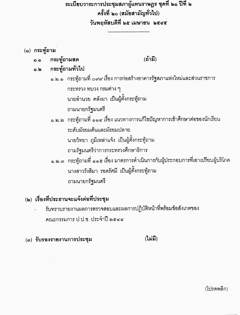 ระเบียบวาระการประชุมสภาผู้แทนราษฎร > ชุดที่ 21 > ปีที่ 2 > สมัยสามัญทั่วไป > ครั้งที่ 20