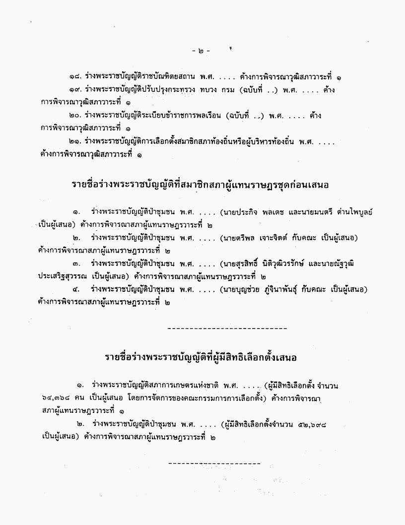 • ยืนยันร่างพระราชบัญญัติที่เสนอโดยคณะรัฐมนตรี / สมาชิกสภาผู้แทนราษฎรชุดก่อนและผู้มีสิทธิเลือกตั้งและยังดำเนินการไม่แล้วเสร็จ ตามมาตรา ๑๗๘ ของรัฐธรรมนูญแห่งราชอาณาจักรไทย
