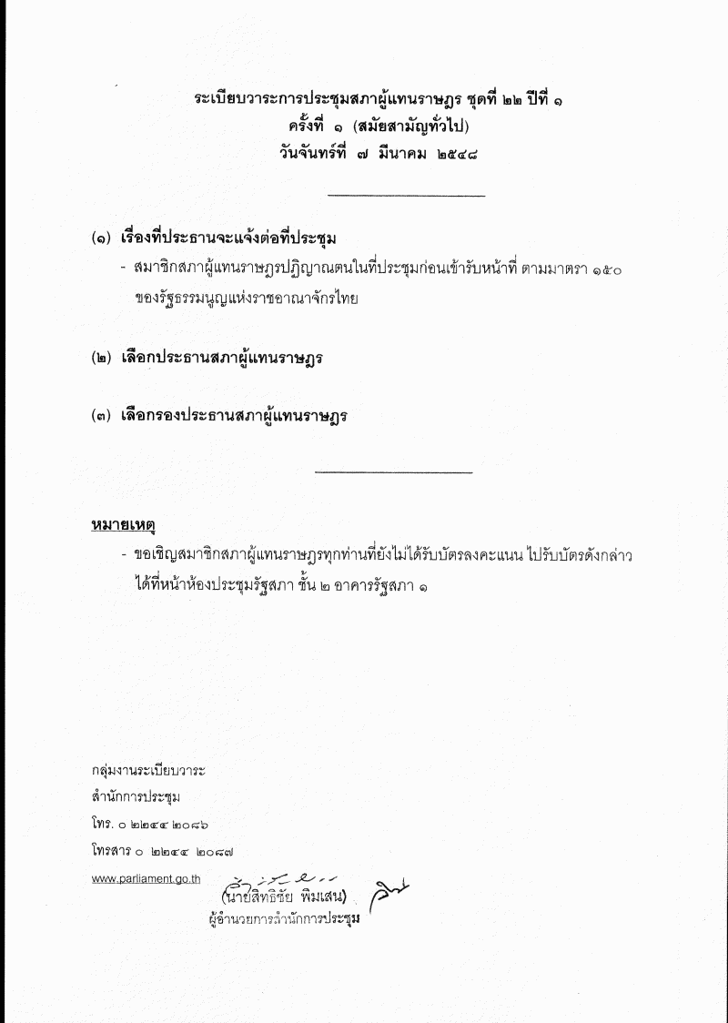 • ระเบียบวาระการประชุมสภาผู้แทนราษฎร ชุดที่ 22 ปีที่ 1 ครั้งที่ 1 (สมัยสามัญทั่วไป) วันจันทร์ที่ 7 มีนาคม 2548