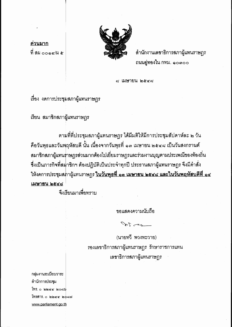 งดการประชุมสภาผู้แทนราษฎร วันพุธที่ 13 และวันพฤหัสบดีที่ 14 เมษายน พ.ศ. 2548 |