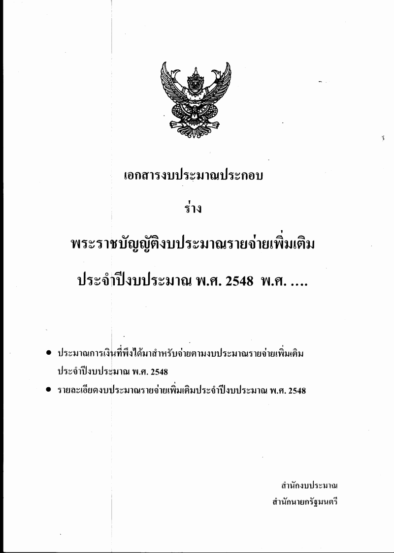 ชื่อเอกสาร :   ร่างพระราชบัญญัติงบประมาณรายจ่ายเพิ่มเติมประจำปีงบประมาณ พ.ศ. ๒๕๔๘ พ.ศ. ....