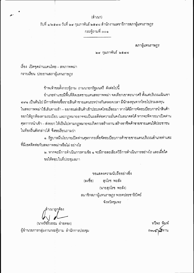 กระทู้ถาม เรื่อง เปิดจุดผ่านแดนไทย-สหภาพพม่า |