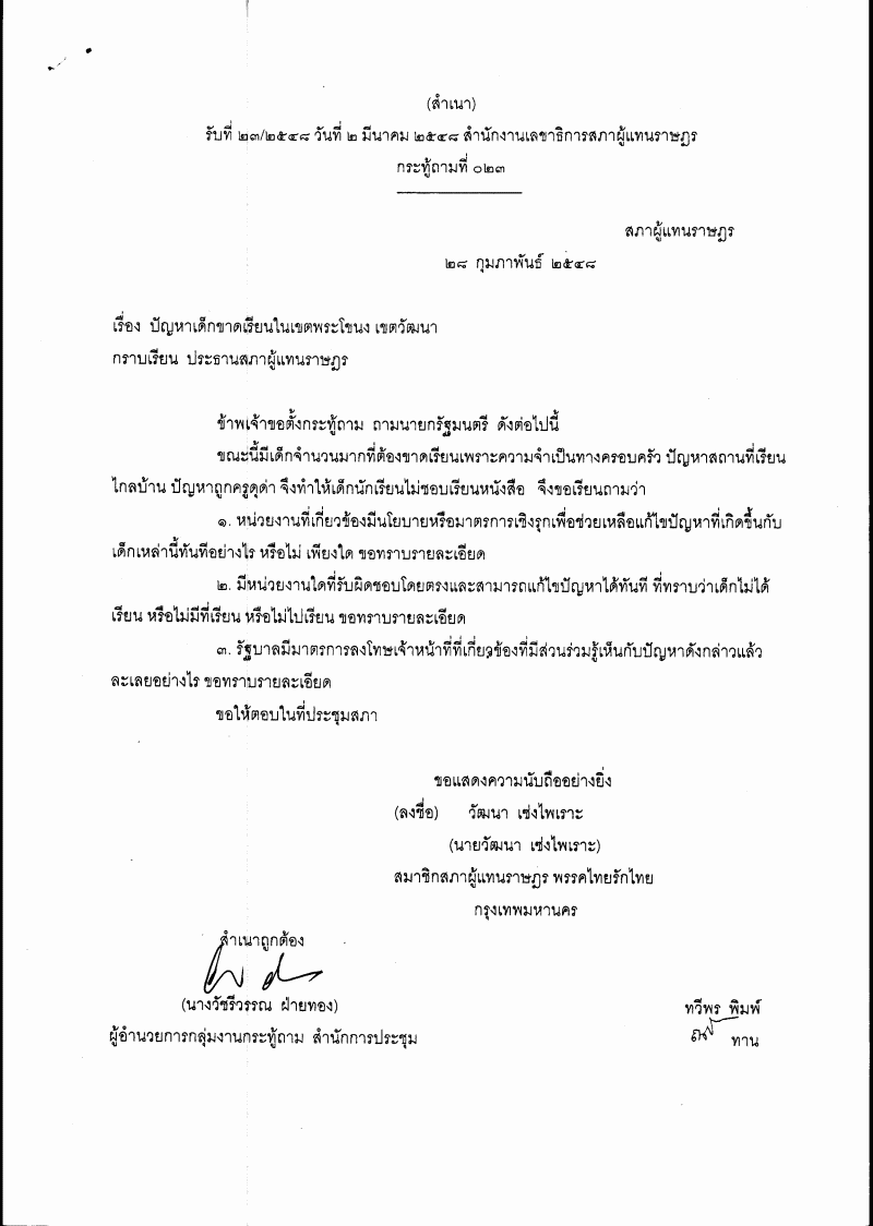 ชื่อเอกสาร : กระทู้ถาม เรื่อง ปัญหาเด็กขาดเรียนในเขตพระโขนง เขตวัฒนา
