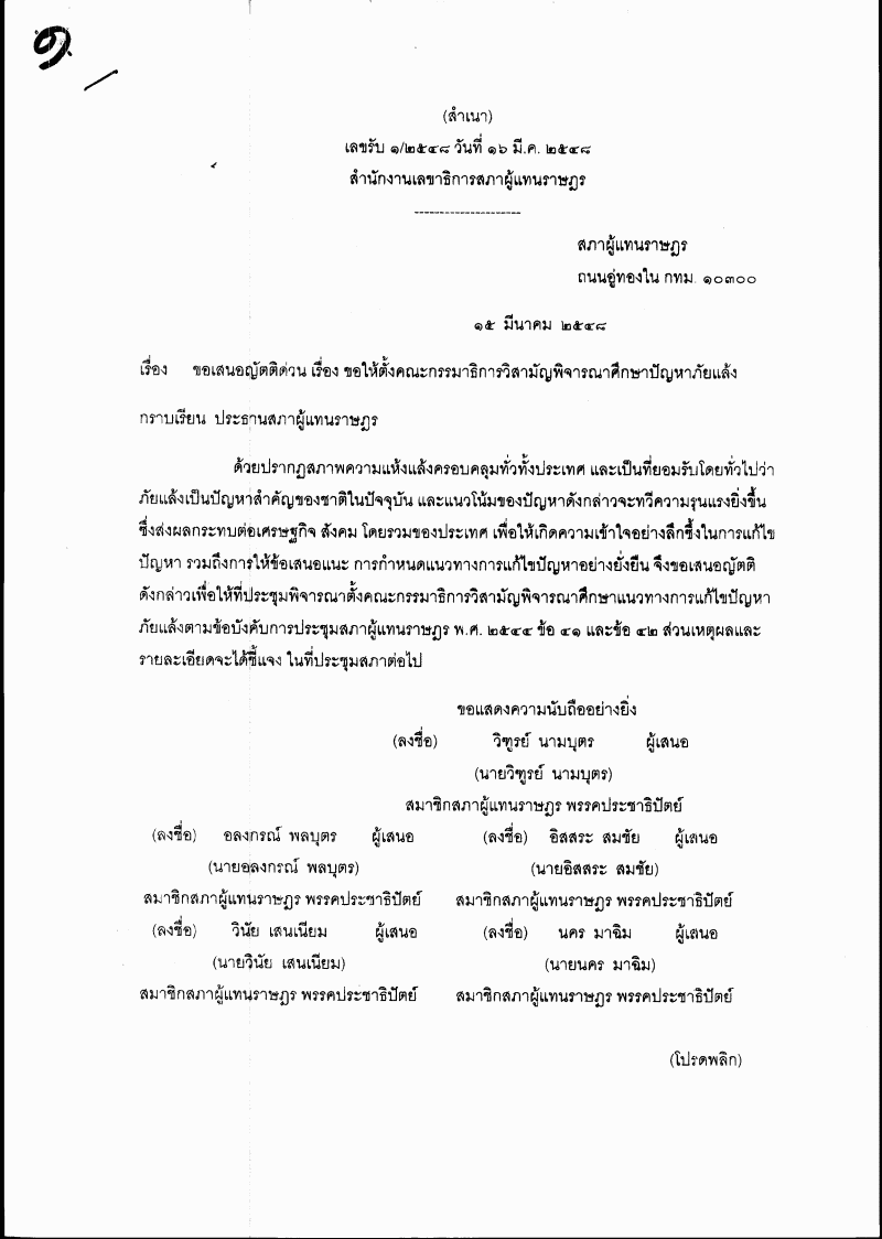 ญัตติด่วน เรื่อง ขอให้ตั้งคณะกรรมาธิการวิสามัญพิจารณาศึกษาปัญหาภัยแล้ง (นายวิฑูรย์ นามบุตร กับคณะ เป็นผู้เสนอ) |
