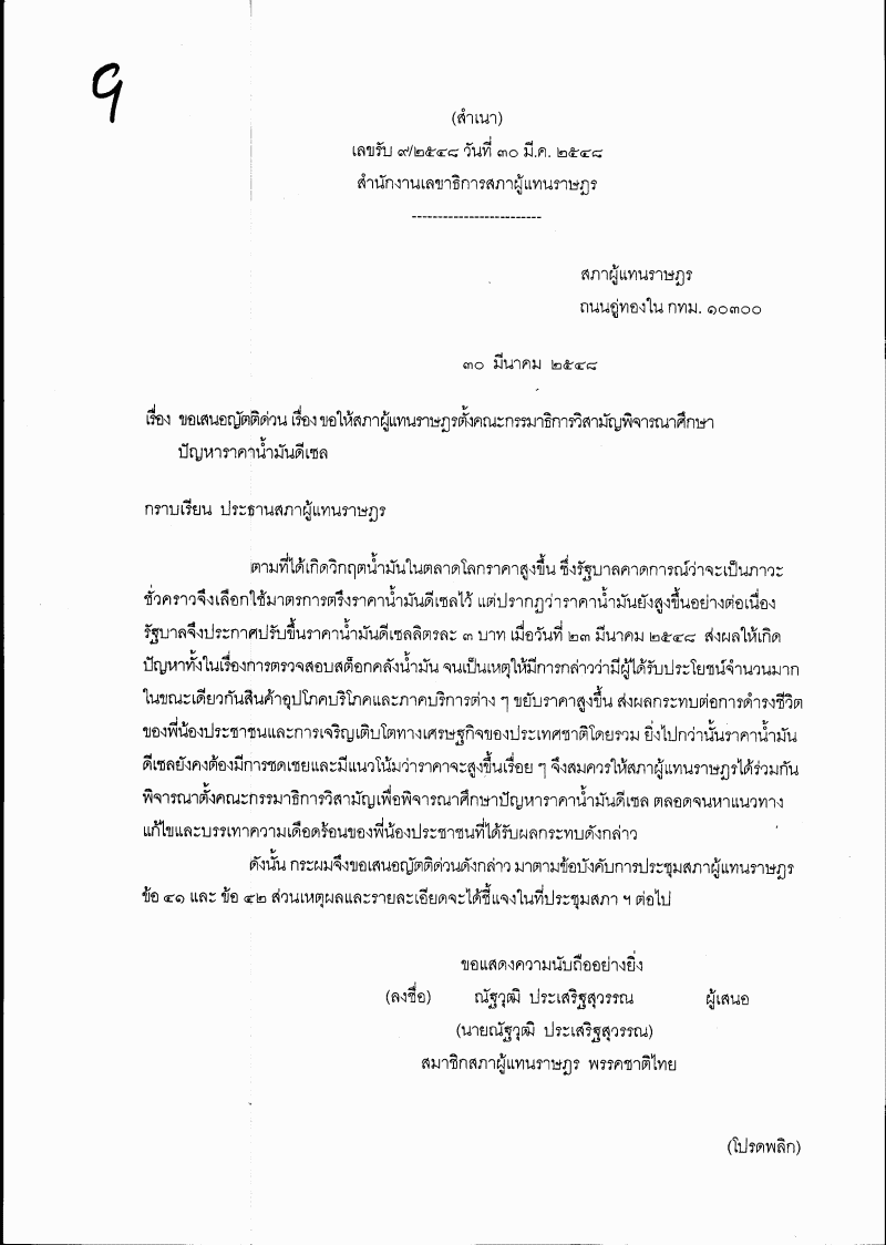 ชื่อเอกสาร :   ญัตติด่วน เรื่อง ขอให้สภาผู้แทนราษฎร ตั้งคณะกรรมาธิการวิสามัญพิจารณาศึกษาปัญหาราคาน้ำมันดีเซล (นายณัฐวุฒิ ประเสริฐสุวรรณ เป็นผู้เสนอ)