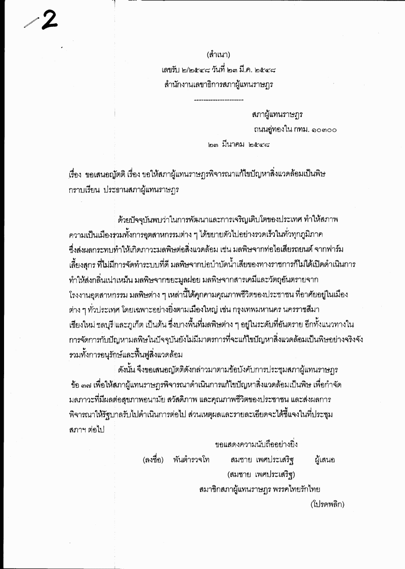 ชื่อเอกสาร :   ญัตติ เรื่อง ขอให้สภาผู้แทนราษฎรพิจารณาแก้ไขปัญหาสิ่งแวดล้อมเป็นพิษ (พันตำรวจโท สมชาย เพศประเสริฐ เป็นผู้เสนอ)