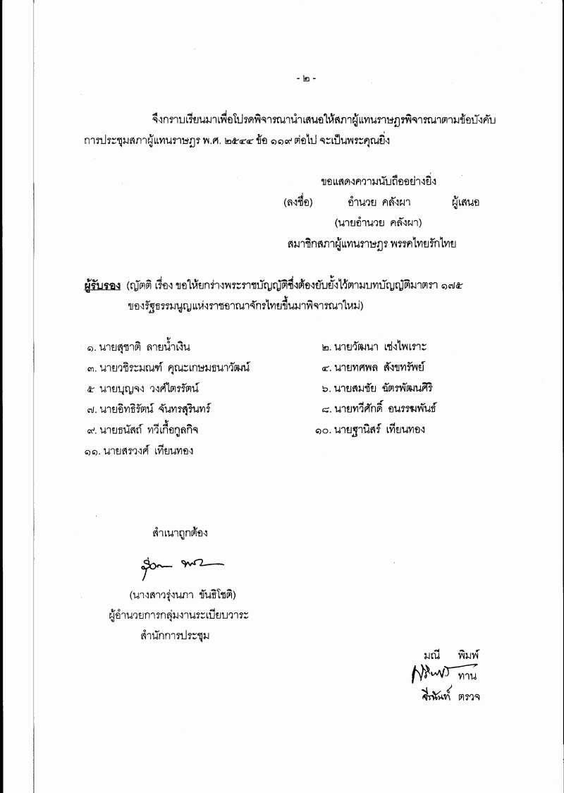 • พิจารณาเรื่อง ขอให้ยกร่างพระราชบัญญัติซึ่งต้องยับยั้งไว้ตามบทบัญญัติมาตรา 175 ของรัฐธรรมนูญแห่งราชอาณาจักรไทยขึ้นมาพิจารณาใหม่ (ร่างพระราชบัญญัติกำหนดค่าธรรมเนียมการใช้ยานยนตร์บนทางหลวงและสะพาน (ฉบับที่ ..) พ.ศ. .... (นายอำนวย คลังผา เป็นผู้เสนอ)