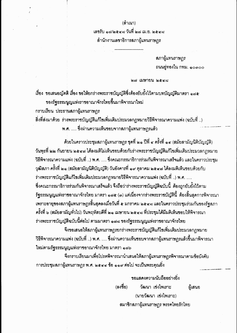 พิจารณาเรื่อง ขอให้ยกร่างพระราชบัญญัติซึ่งต้องยับยั้งไว้ตามบทบัญญัติมาตรา 175 ของรัฐธรรมนูญแห่งราชอาณาจักรไทยขึ้นมาพิจารณาใหม่ (ร่างพระราชบัญญัติแก้ไขเพิ่มเติมประมวลกฎหมายวิธีพิจารณาความแพ่ง (ฉบับที่ ..) พ.ศ. ....) ปรับปรุงการบังคับคดีการคุ้มครองสิทธิเจ้าหนี้และลูกหนี้ในการบังคับคดีตามคำพิพากษาและอัตราค่าธรรมเนียม) (นายวัฒนา เซ่งไพเราะ เป็นผู้เสนอ) |