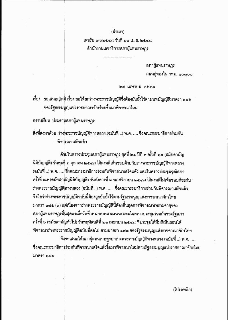• พิจารณาเรื่อง ขอให้ยกร่างพระราชบัญญัติซึ่งต้องยับยั้งไว้ตามบทบัญญัติมาตรา 175 ของรัฐธรรมนูญแห่งราชอาณาจักรไทยขึ้นมาพิจารณาใหม่ (ร่างพระราชบัญญัติทางหลวง (ฉบับที่ ..) พ.ศ. .... (นายสามารถ แก้วมีชัย เป็นผู้เสนอ)